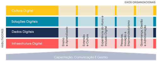 O desenvolvimento da UFRPE Digital envolve toda a organização e é representada na relação de dois componentes básicos: eixos organizacionais e habilitadores transformacionais. Os habilitadores devem ser trabalhados de forma transversal para a evolução de cada eixo organizacional que, por sua vez, compreende as principais áreas de atuação da UFRPE. Cada eixo precisa ser trabalhado em termos de todos os habilitadores para ter seus processos transformados.