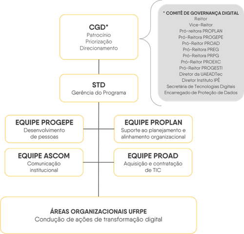 O Comitê de Governança Digital (CGD) é gestor e patrocinador do programa, com responsabilidade de direcionar as prioridades da organização, contando com o suporte da Secretaria de Tecnologias Digitais (STD) na liderança do programa de transformação e a participação de todas as áreas institucionais, conforme organograma a seguir.